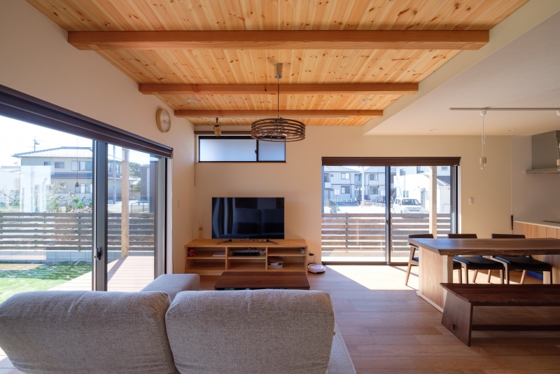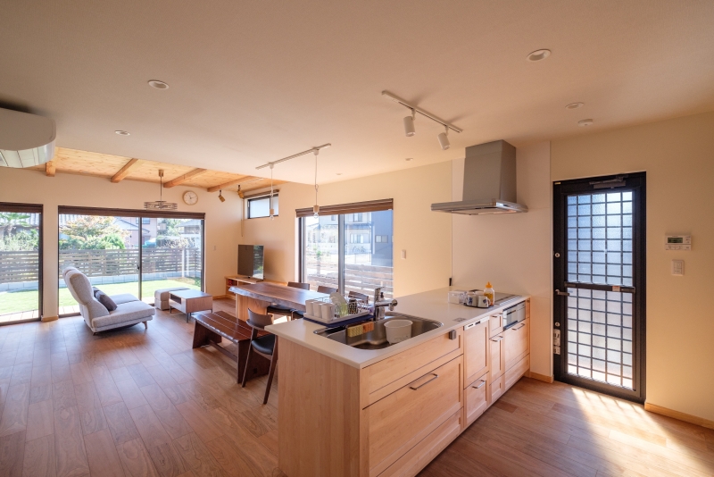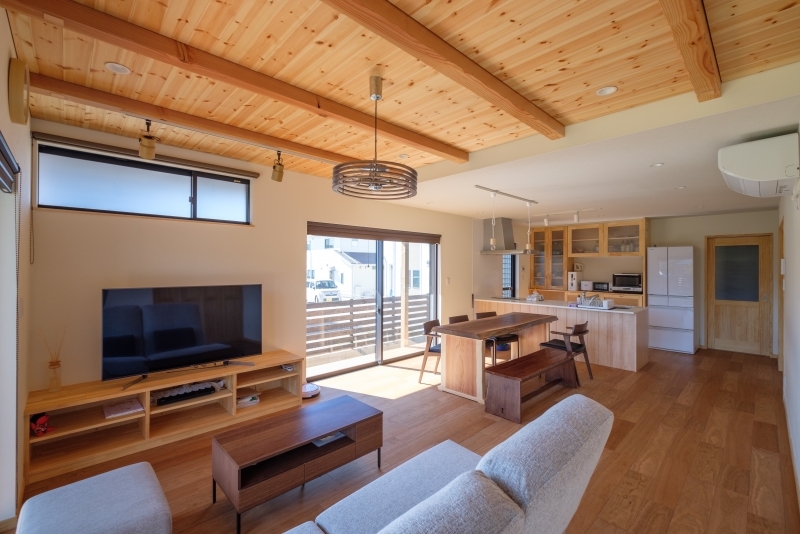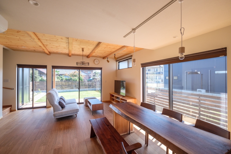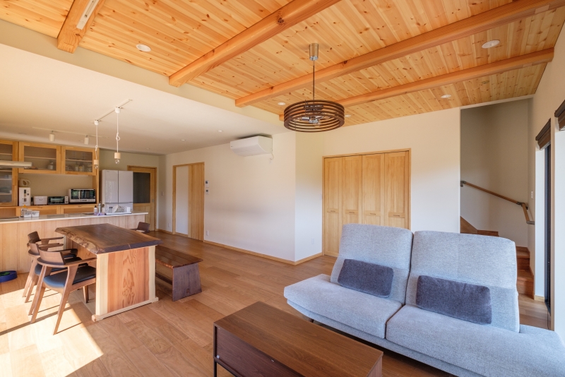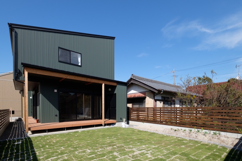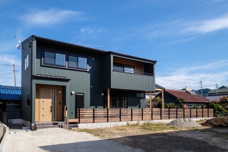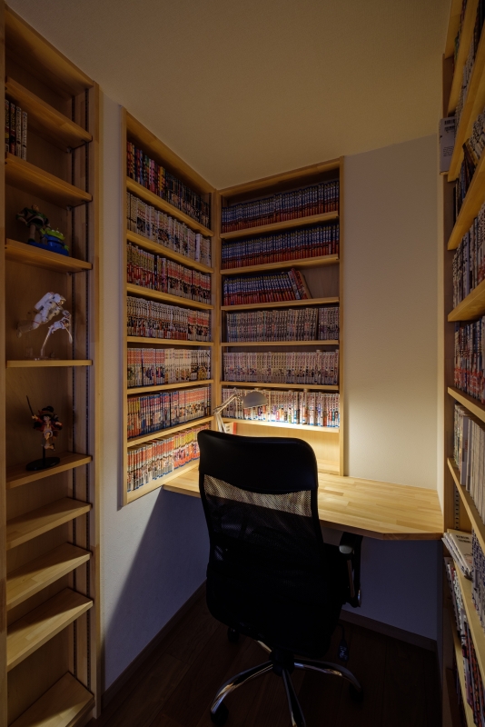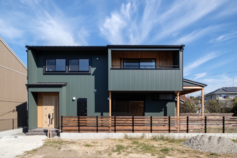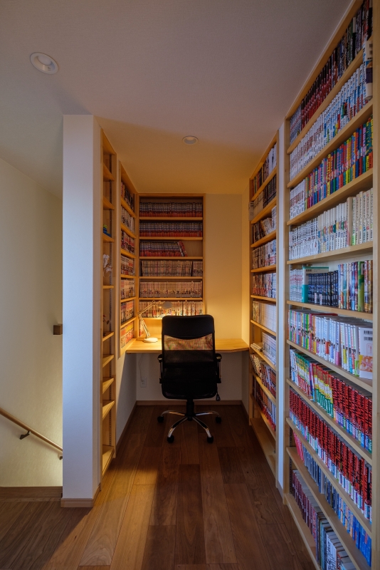 緑と漫画の家 緑と漫画の家 漫画喫茶のような空間を作りたいという要望を形にしました。外観は緑色のガルバリウム鋼板をメインにジョリパットや杉の羽目板をアクセントに貼っています。内装は松の羽目板を使い、自然素材を感じられます。2階のホールを広めに取り、漫画喫茶のような空間を創りました。